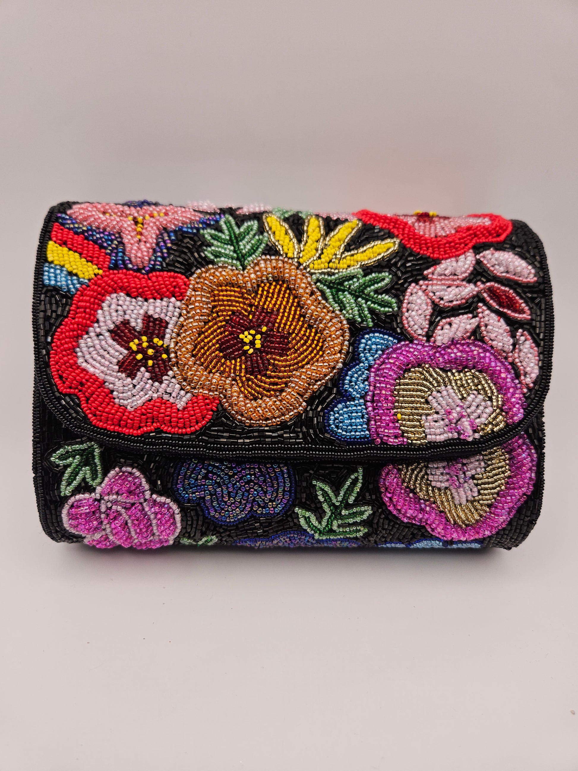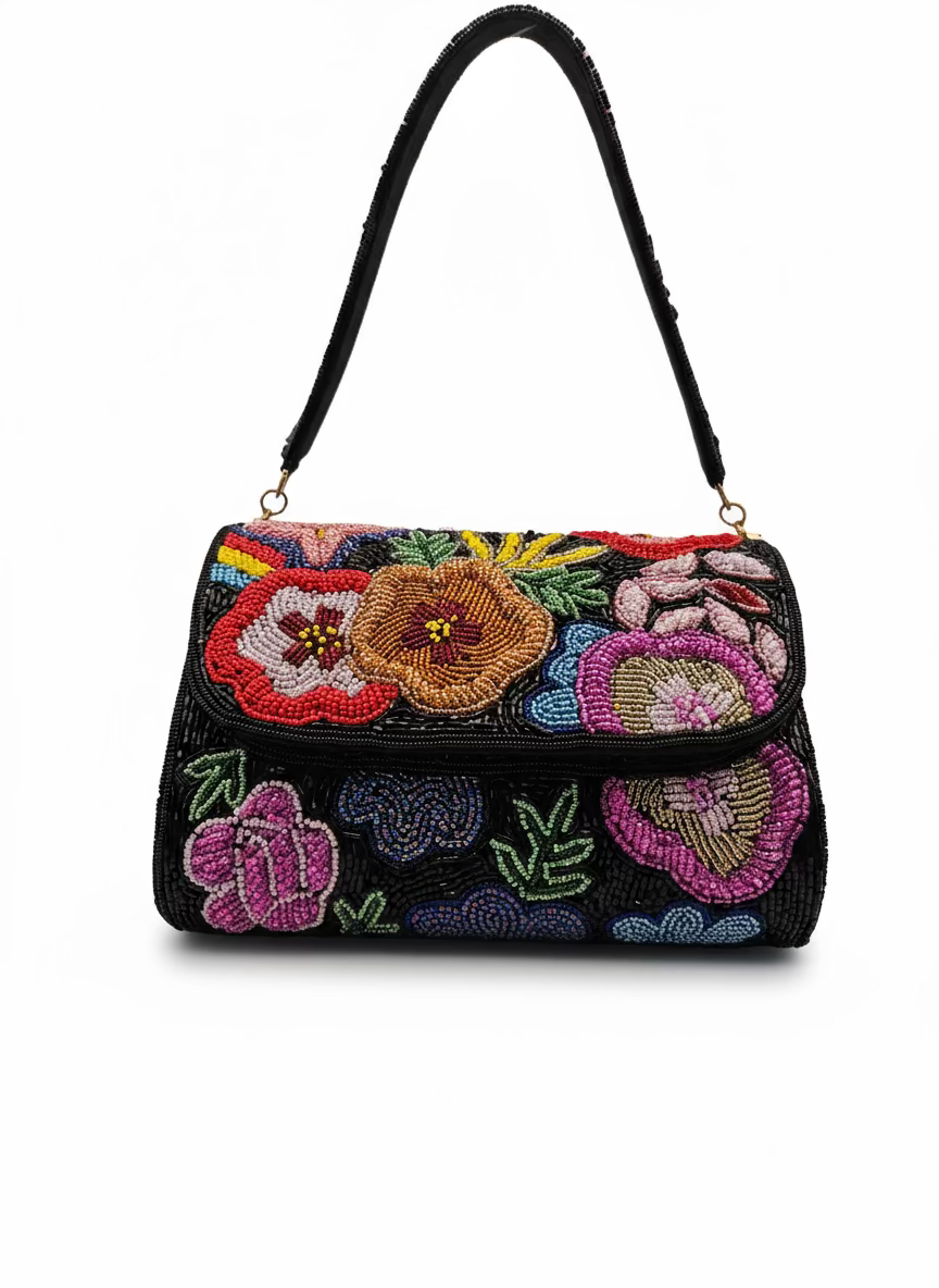 She’s a masterpiece in motion — black as night but bursting with multi-colored flowers that celebrate life, art, and fearless style. She’s fiery, feisty, and unapologetically bold, turning heads wherever she goes. Every detail whispers craftsmanship and creativity, carrying your essentials with the same passion she radiates.