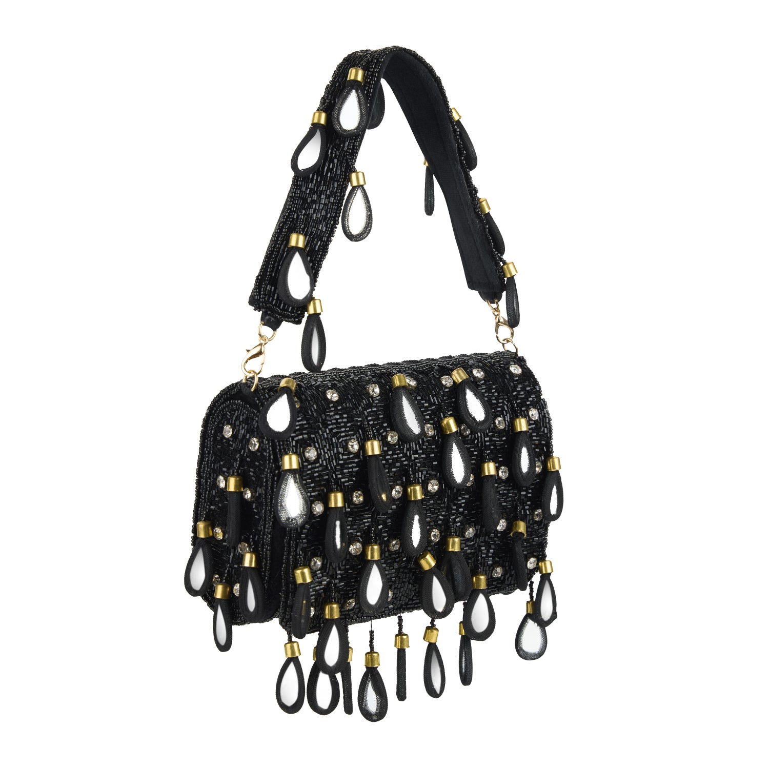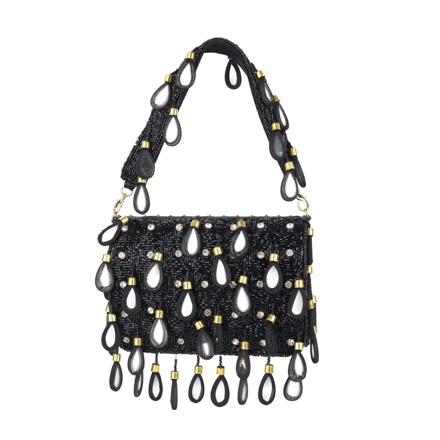 A statement in black, this handcrafted clutch shimmers with mirror teardrops, diamond accents, and black beadwork that catches the light with subtle movement. Graphic and striking, the design balances bold expression with refined elegance, making it ideal for evening and occasion wear. Finished with a removable strap, it transitions effortlessly from a clutch to a bag worn hands-free.