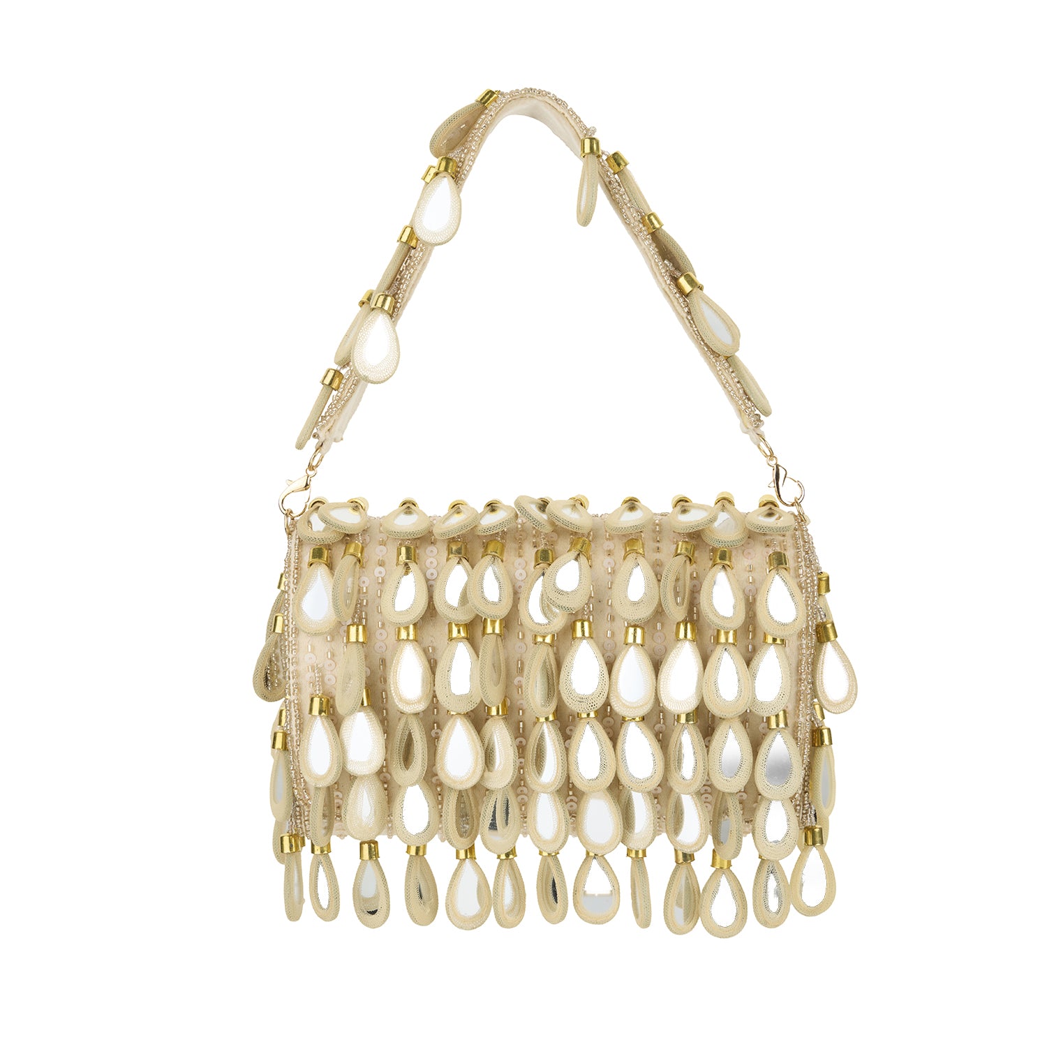 Meet Noor — an ivory beauty that sparkles with tiny hand-stitched mirror teardrops and delicate beadwork designed to catch the light with subtle movement. Elegant yet effortless, she brings a soft, luminous finish to evening and occasion looks. Designed with a removable strap, Noor can be carried as a clutch or worn hands-free, comfortably fitting your phone, wallet, and a few makeup must-haves.