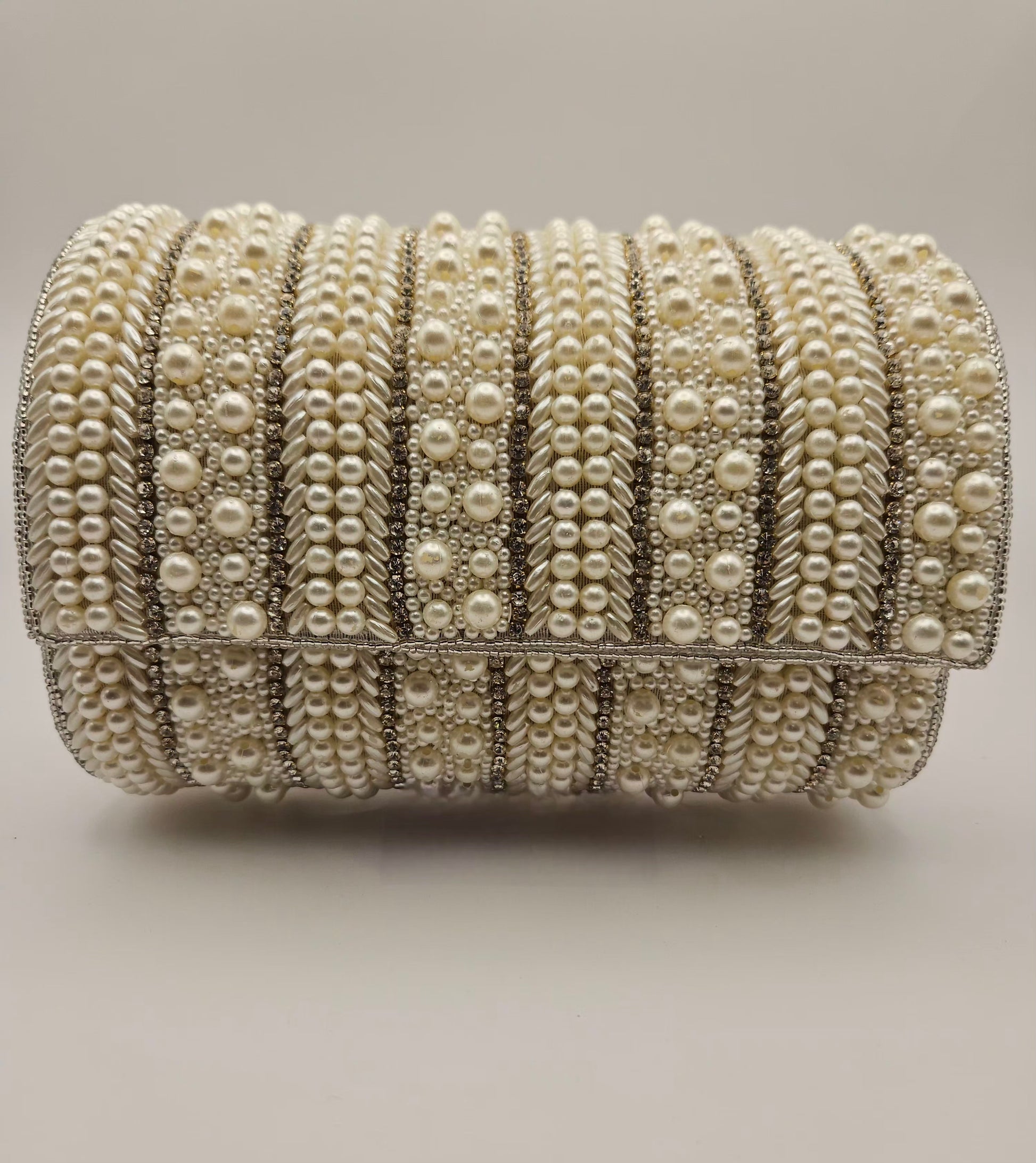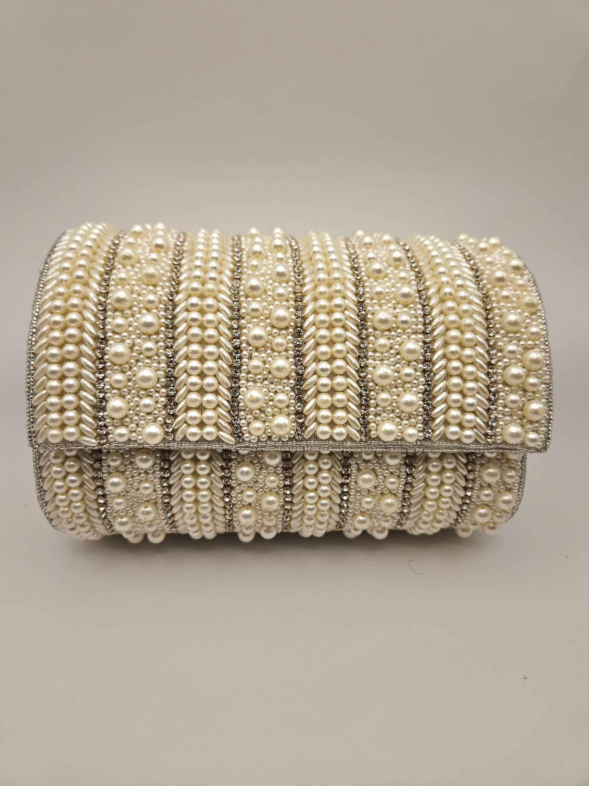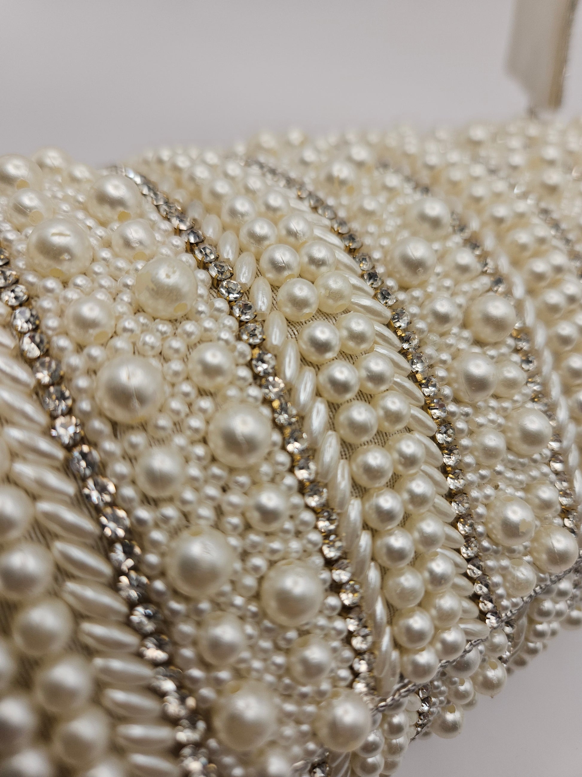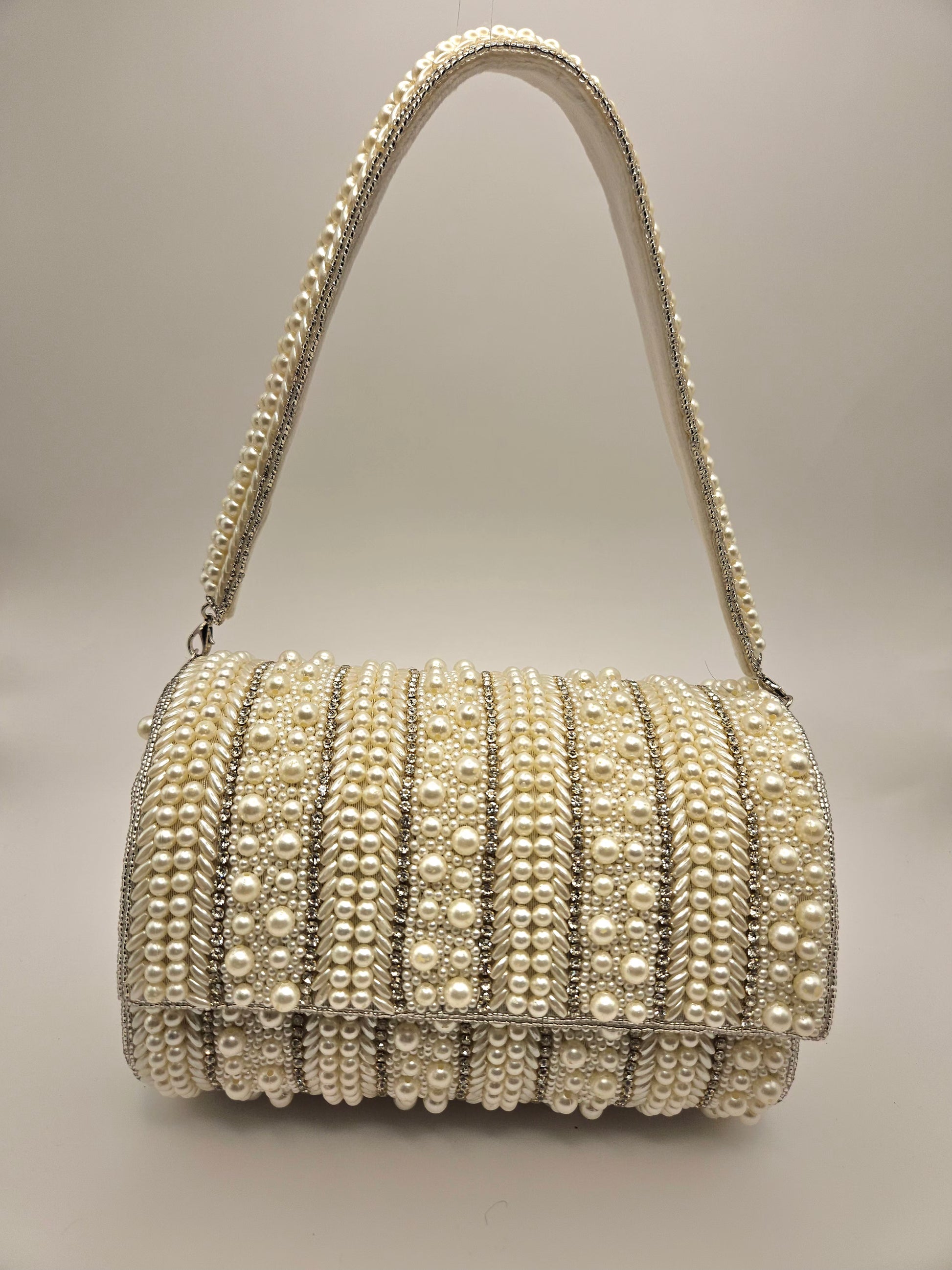 She’s pure sophistication — dressed in white, kissed with pearls and diamonds that catch the light with every move. She’s the one you reach for when the moment calls for grace — from aisle walks to champagne toasts. Delicate, poised, and endlessly elegant, she carries your essentials and your confidence with equal ease.