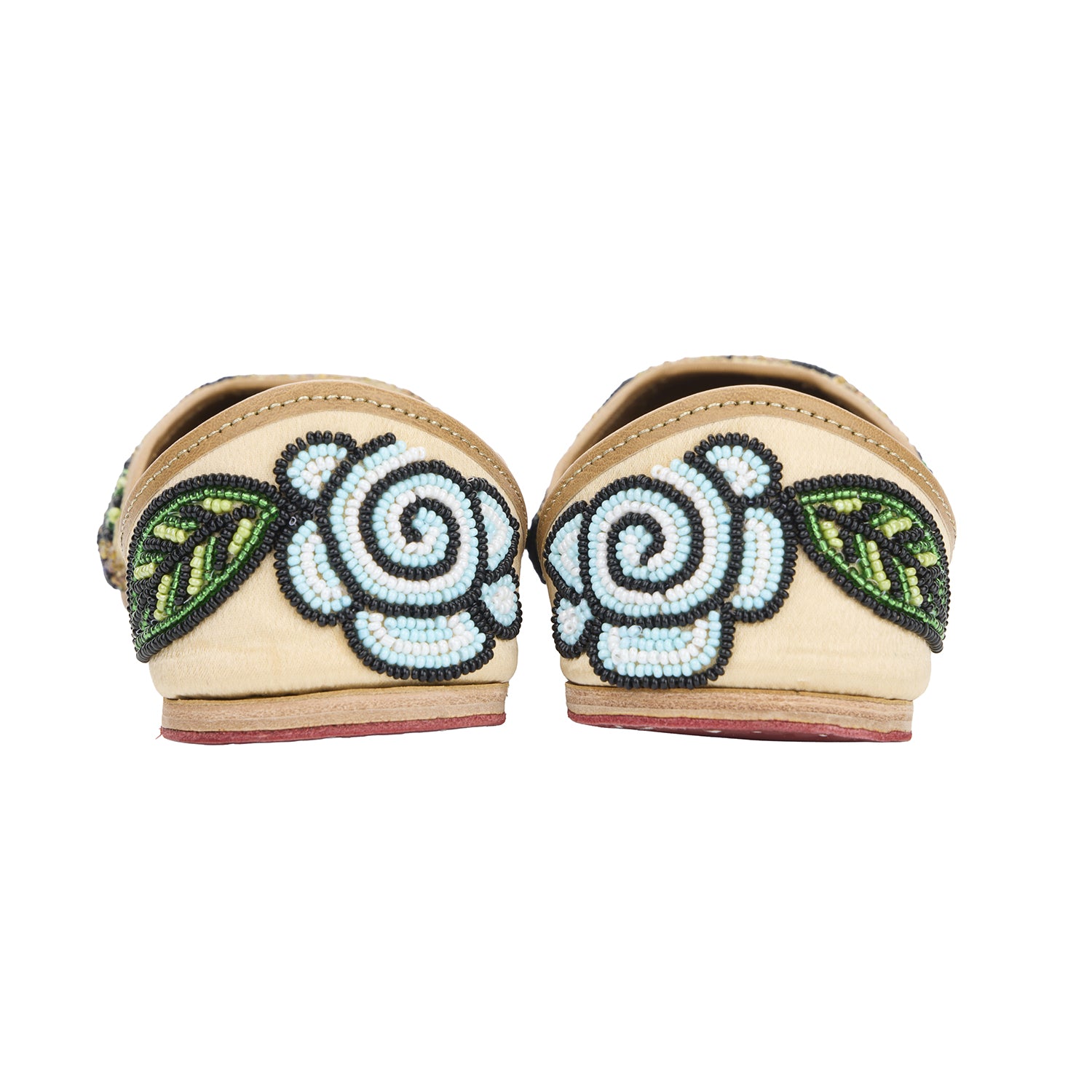 • Design: Abstract hand-beaded faces in vibrant tones Color Palette: Red, turquoise, green, blue with neutral base Upper Material: Premium fabric base with intricate bead embroidery Lining: Soft leather lining for breathable comfort Sole: Genuine leather sole with flexible finish