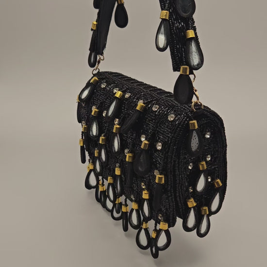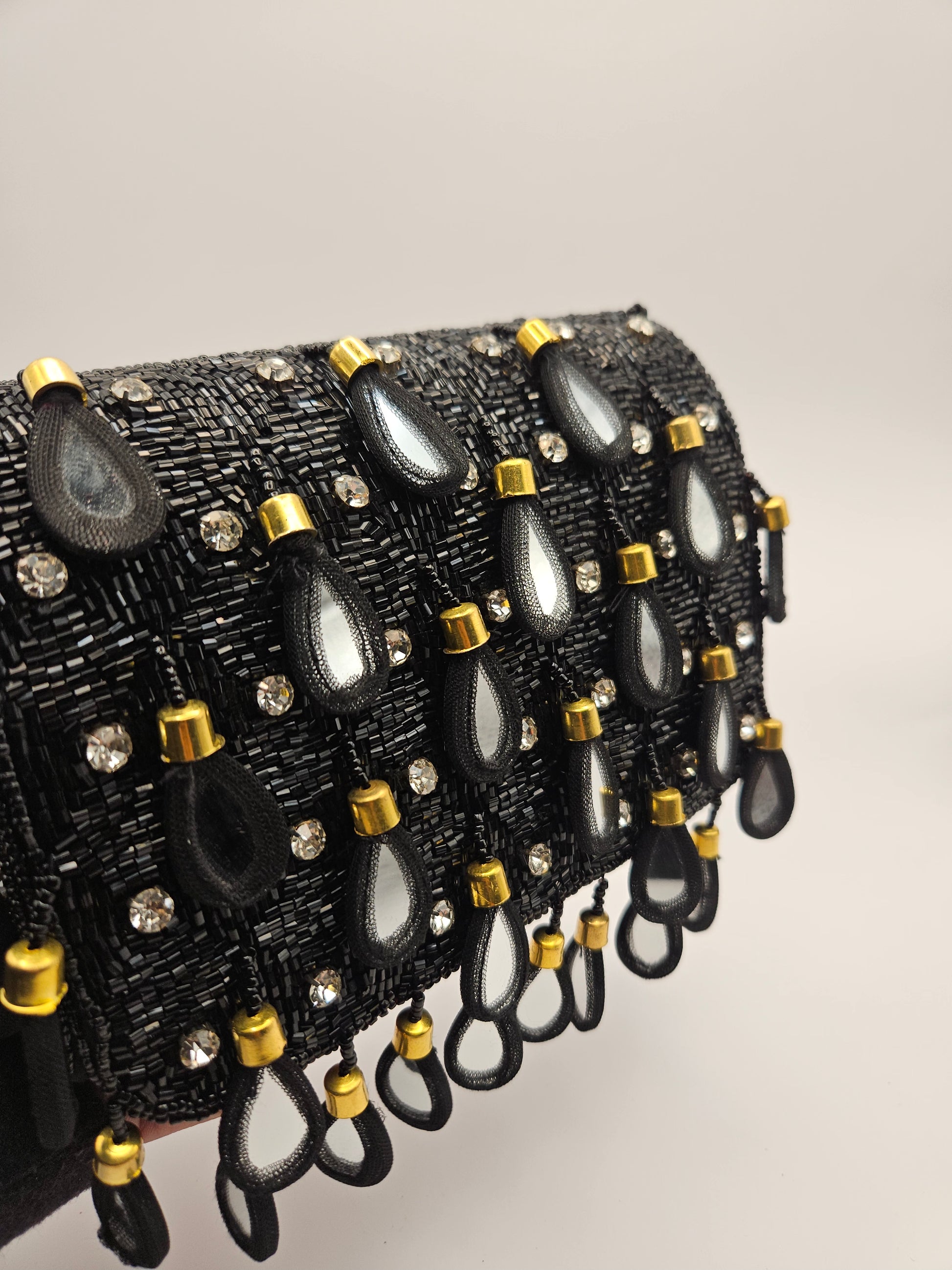 A statement in black. This handcrafted clutch shimmers with mirror teardrops, diamond accents, and black beads that catch the light just right. Designed with a removable strap, she transitions effortlessly from an elegant evening look to a hands-free affair.