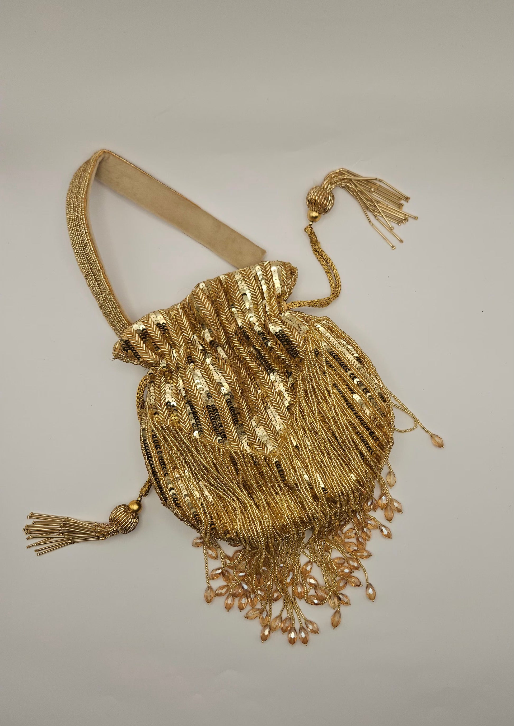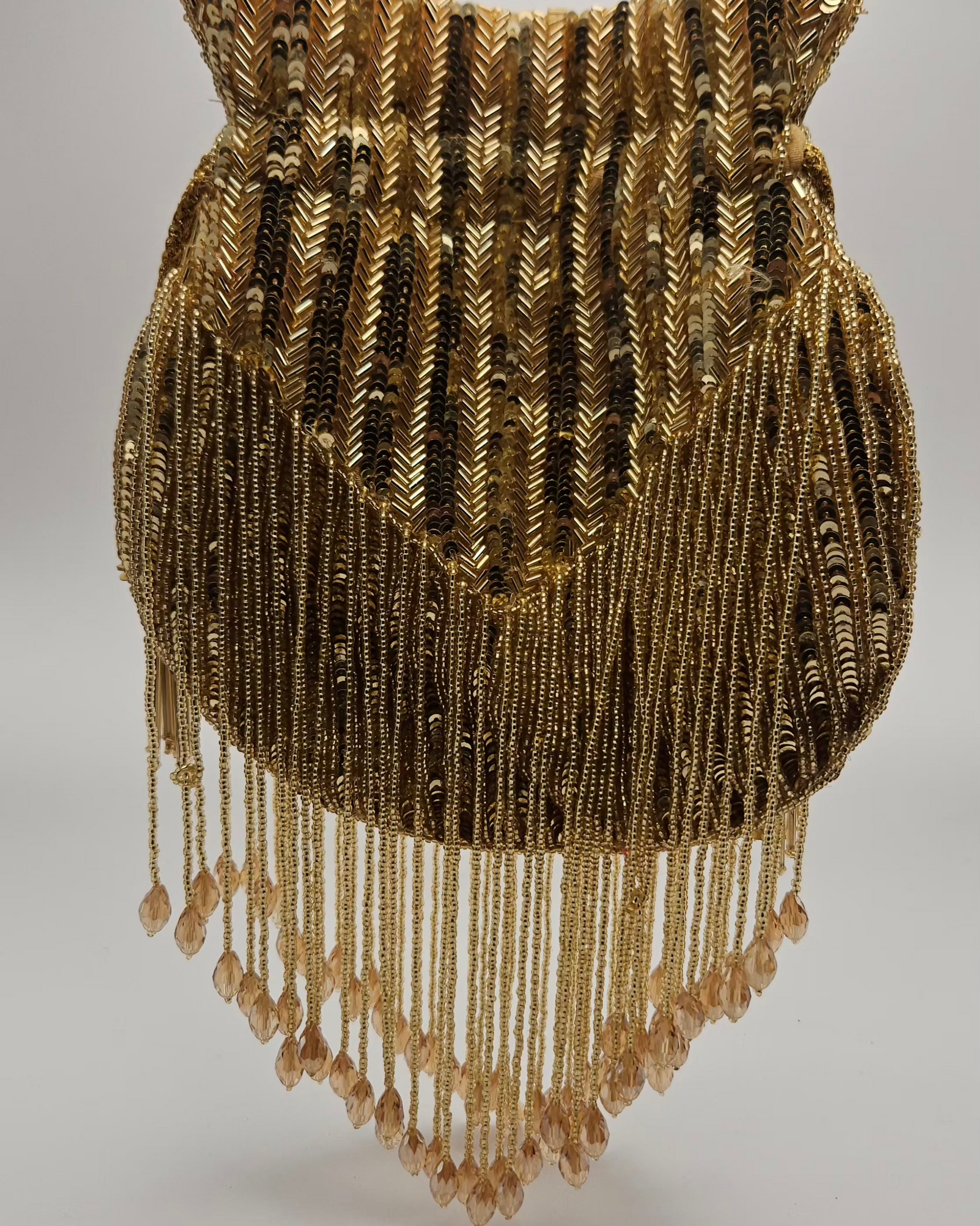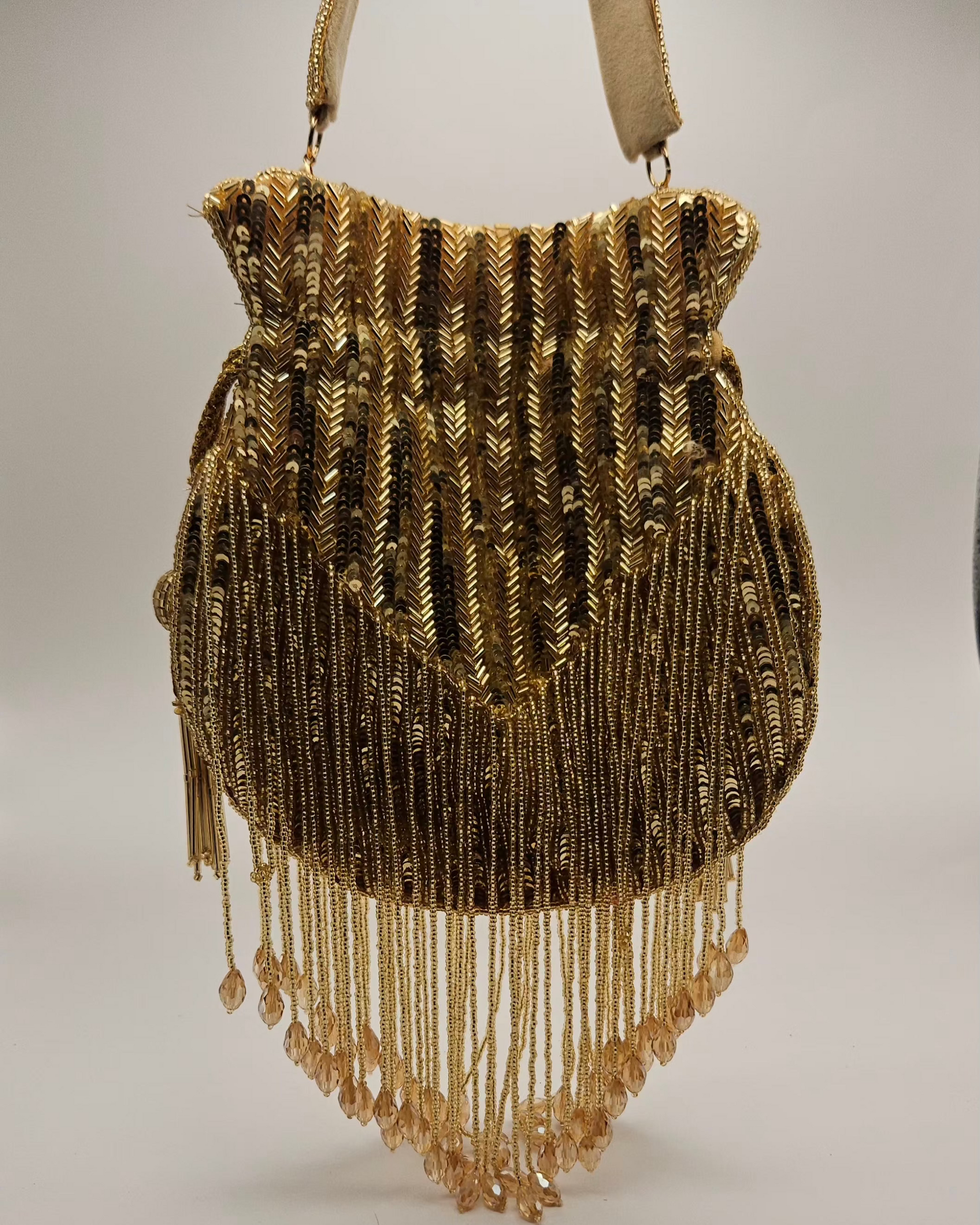 She adorns golden sequins and dances with long, flowing tassels that sway with every step. Soft yet striking, she carries your essentials with understated luxury, perfect for a night at the opera or a glamorous wedding. She is the kind of companion who turns heads and lights up the room with her classic, sophisticated charm.